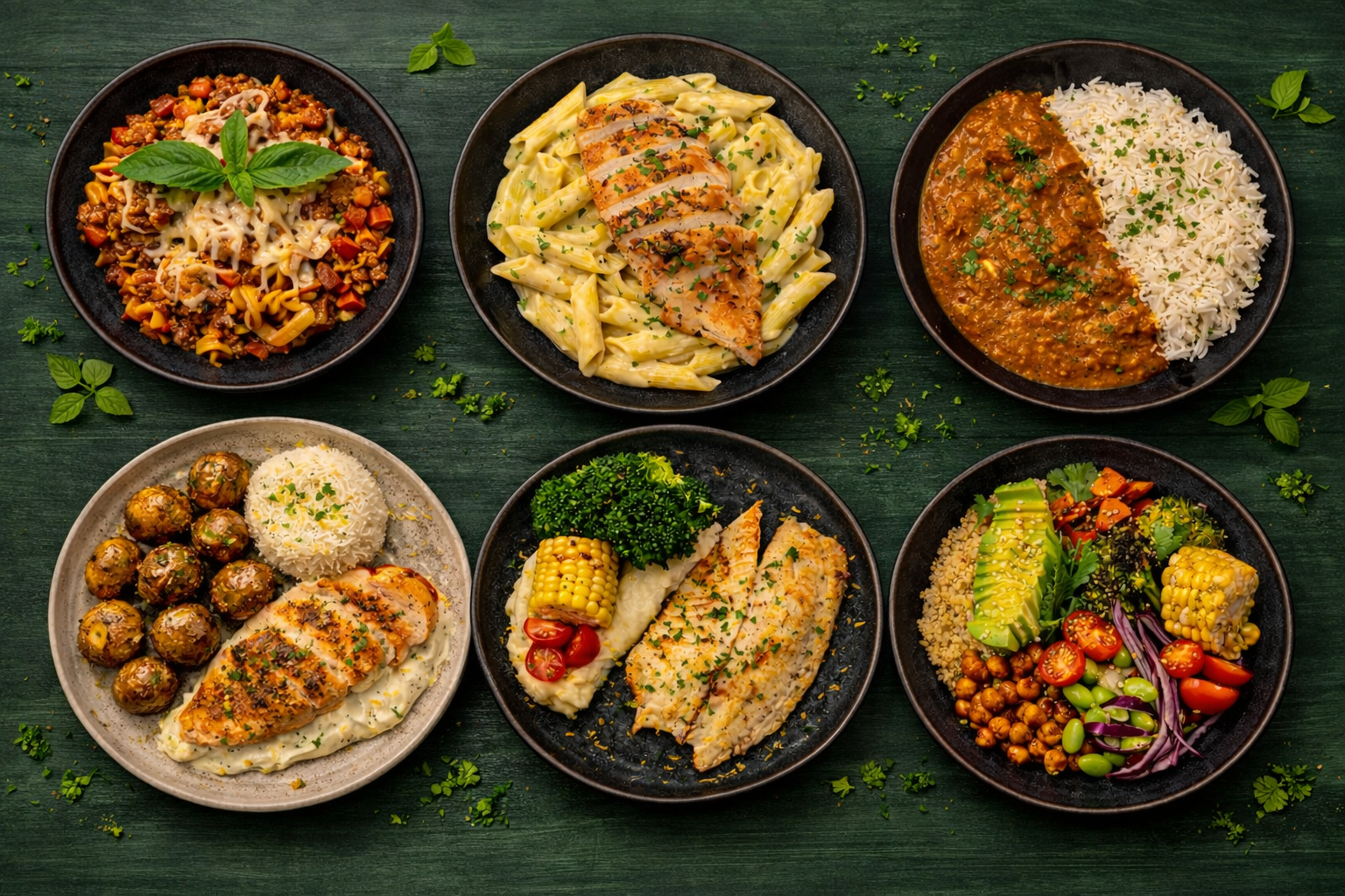 A selection of balanced meals made with simple ingredients and fresh flavors.
